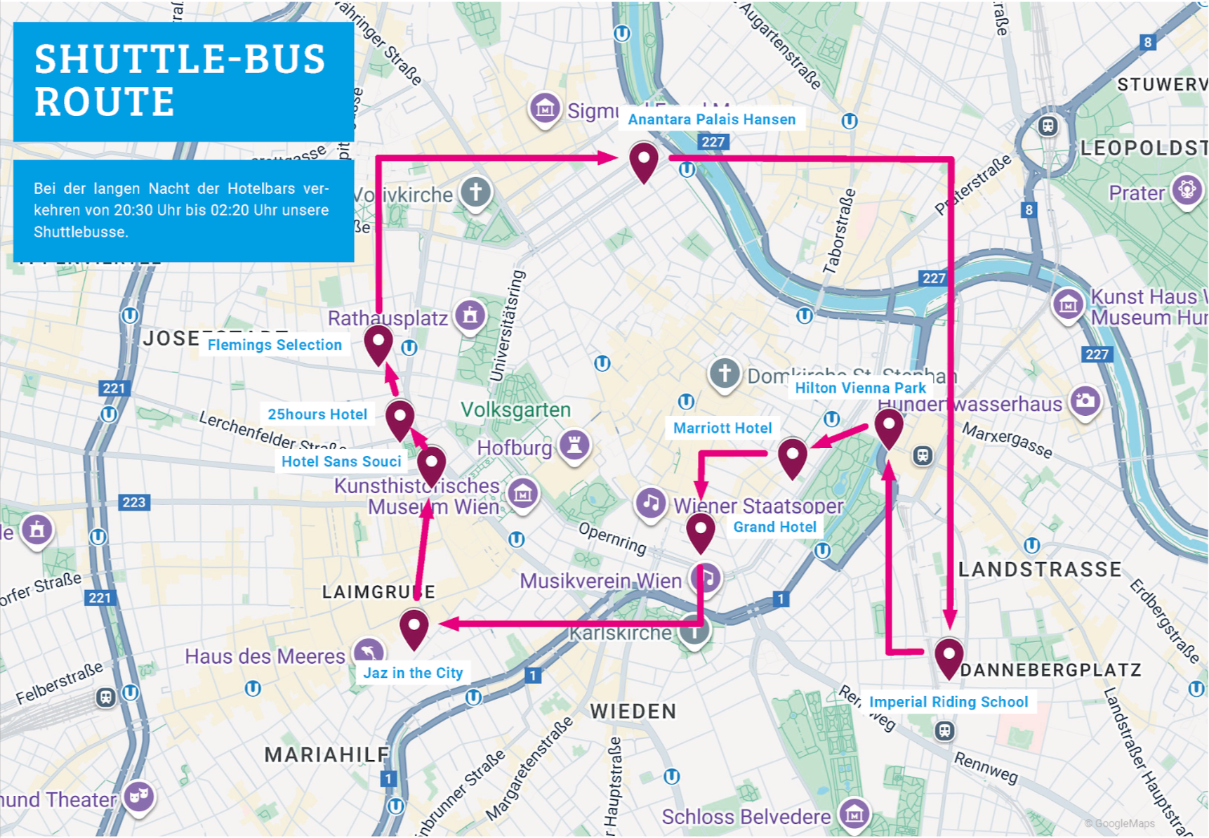 Hier die genaue Route und der Fahrplan. Route und Fahrplan sind auch in unserer Veranstaltungsbroschüre abgedruckt, die Sie am Abend von unseren Hostessen erhalten werden.