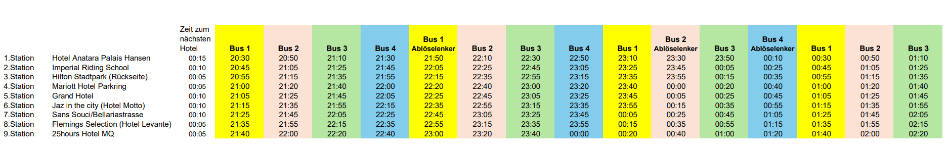 Die Busse halten direkt vor den teilnehmenden Hotels, außer bei: